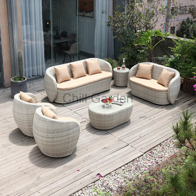 Material: PE rattan weaving, steel, with Guchen cushion, tempered glass (table)