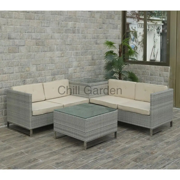Material: PE rattan woven, stainless steel, with cushions, tempered glass (table & storage box)