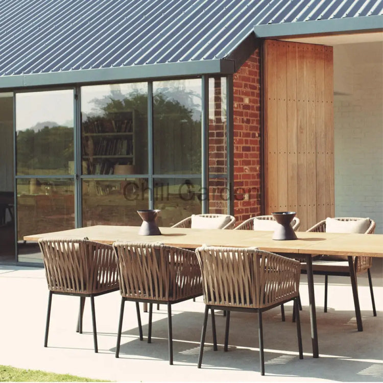 Material: PE rattan woven, aluminum, with Guchen cushion, plastic wood (long table)