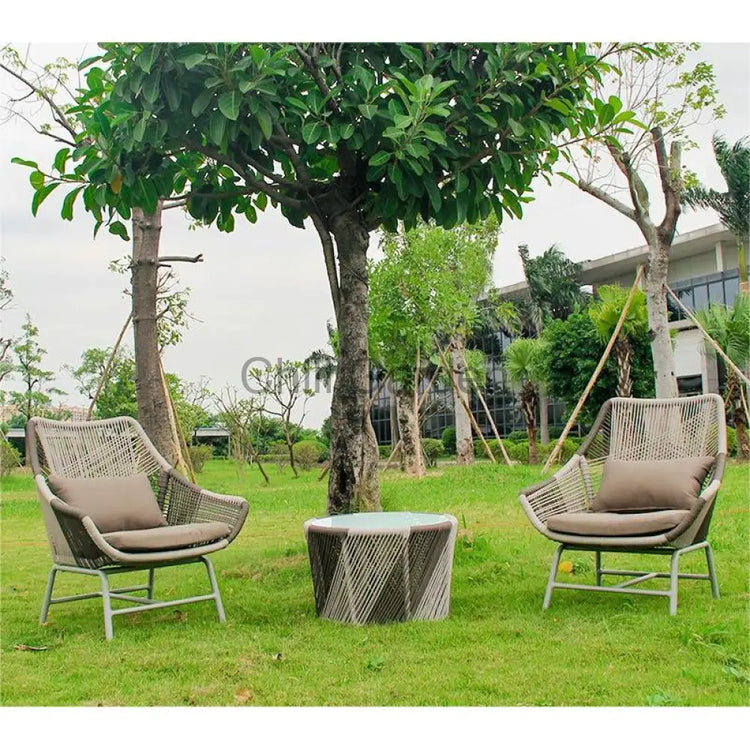 Material: Textilene braided rope, titanium-magnesium alloy, with Guchen cushion, tempered glass (coffee table)