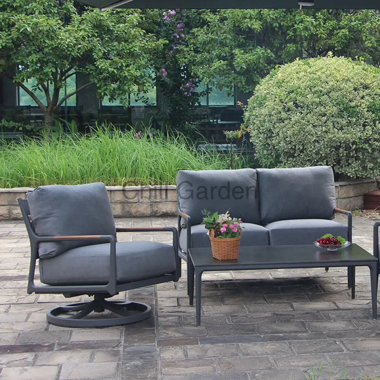 Materials: Aluminum, teak (armrests), cushions, rock board (coffee table)