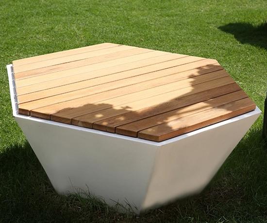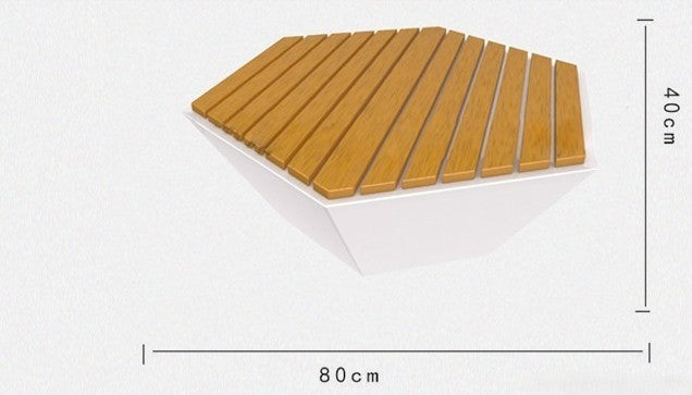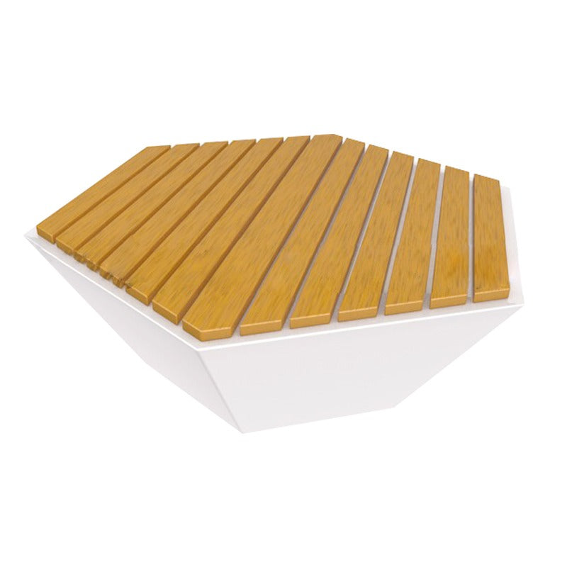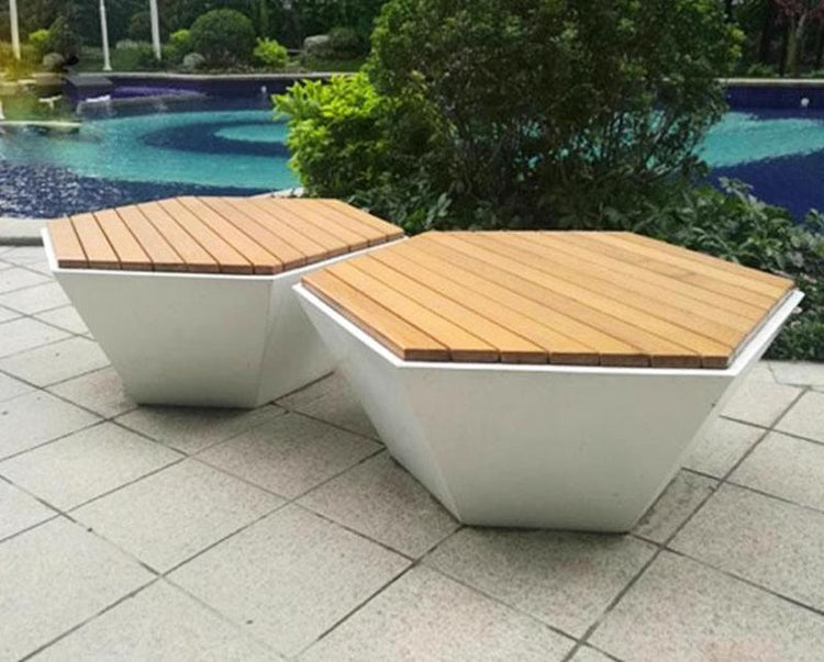 正六邊形為設計語言,白色玻璃鋼底座稜角分明,搭配平行排列的原木條坐面,幾何美學與自然材質相互呼應。可單獨擺放,亦可多個拼合形成蜂巢式組合,靈活適應各種戶外景觀場景。